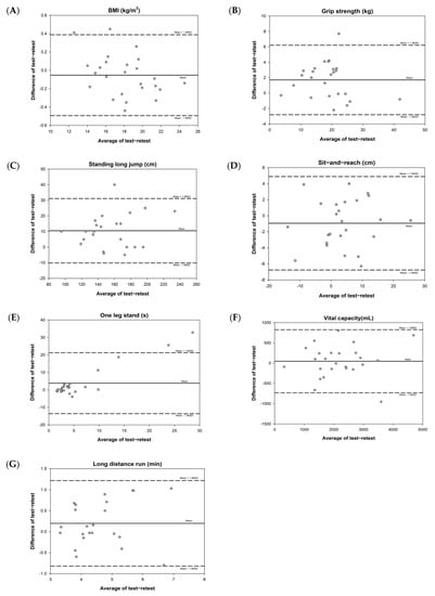 The Bland–Altman plots demonstrated no major systematic bias for all of the physical fitness tests excepted for the one leg stand test, for which the scores were mainly below the mean difference (see Figure 2). The 95% limits of agreement of physical fitness tests were as follows: BMI [−0.49, 0.39], grip strength [−2.81, 6.22], standing long jump [−10.17, 31.13], sit-and-reach [−6.76, 4.89], one leg stand [−13.59, 21.29], vital capacity [−731.54, 826.58], and long distance run [−0.82, 1.22]. Taken together, the majority of these tests appeared to have reasonable test–retest reliability.