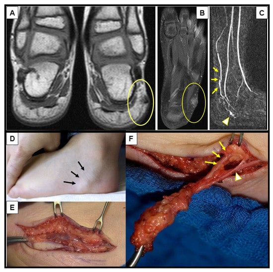 A 3-year-old boy with a pulsatile lesion under the malleolus lateralis of the left foot (D)—(black arrows). MRI showed a localized arterio-venous malformation in the subcutaneous tissue (A,B) with an AV shunt in the MR-angiography (C)—(arrowhead) depicted by the early visualization of the vein (C)—(yellow arrows). Complete surgical excision was performed (E) with ligation of the feeding artery (F)—(yellow arrows) and the draining veins (F)—(arrowhead).