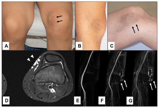 An 11-year-old boy presented with bluish swelling medially on the left knee (A): white (arrowheads). The lesion was compressible and would drain and flatten with the elevation of the leg indicating clinically the venous malformation (B,C)—(white arrowheads). MRI showed the exact location and extension of tubular-cystic venous malformation (D)—(white arrowheads), which filled with contrast material in the venous phase of the MR angiography (E–G)—(white arrows), confirming the clinical diagnosis. The patient was referred to sclerotherapy.