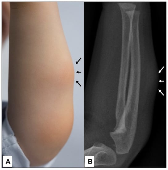 A 2-year-old boy was presented by his parents due to the swelling on the left forearm, which persisted for the last 2 months (A)—(black arrows). Because the subcutaneous lump was firm and immobile, an X-ray was conducted to exclude bone abnormalities (B). Note the homogenous soft tissue expansion in the subcutaneous area (white arrows) but no osseous involvement.