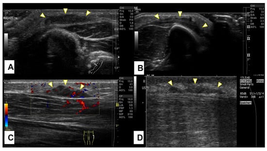 Representative slices of ultrasound imaging of subcutaneous granuloma annulare (SGA). The lesions are strictly epifascial with hypo- and hyper-echogenic zones and mild hypervascularization. A common finding is the cap shape of these lesions, marked with arrowheads. The depicted lesions were located on (A) the right forearm; (B) the right lower leg; (C) the left lower leg; (D) the right lower leg.