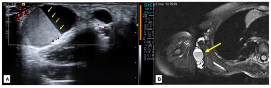 A 2.5-year-old girl with a sudden appearance of a lump in the right axilla. Ultrasound examination showed a multi-cystic mass with intracystic bleeding documented by the fluid-fluid level in the cyst representing the clot retraction (A)—(yellow arrows). The MRI (B) showed the exact extension of the mass (arrow), which was limited to the subcutaneous tissue and facilitated the indication for surgical resection.