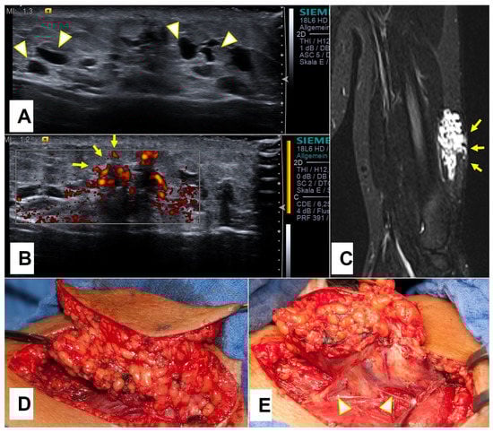 A 14.5-year-old boy was presented because of the minor swelling on his left upper arm, which appeared after he started to go to the gym. Ultrasound imaging showed a tubulo-cystic lesion (arrowheads) on the lateral aspect of his upper arm (A) which showed perfusion (arrows) in a power Doppler mode with venous flow characteristics (B). MRI depicted a venous malformation (arrows) of the localized extension located in the subcutaneous area (C). Complete excision of the VM was performed (D). Draining veins are depicted with arrowheads (E).