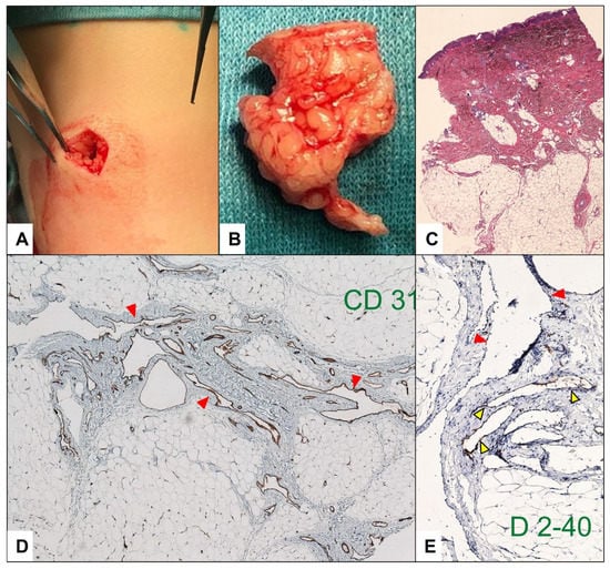 The patient from Figure 7 underwent an incisional biopsy of the pretibial lesion at 15 months of age (A,B). The H&E staining showed no granulomatous tissue in specimen (C). Immunohistochemistry showed irregular, dilated vascular structures surrounded by fat tissue in the deep subcutaneous tissue layer, which strongly expressed the CD31 vascular marker (D)—(red arrowheads). D2-40 (E) stains positive in the lymphatic component (yellow arrowheads) and is negative in the endothelial cells of the veins (red arrowheads).