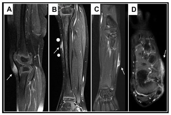 These images show representative MRI slices through SGA (indicated by white arrows) at the knee (A); lower leg (B); forearm (C); and foot (D) in four different cases. Note that all SGA lesions show the typical epifascial extension with gradual rise of the lesion towards the more superficial tissues, which we have named the “epifascial cap” sign.