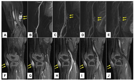 - Rak, K.M.; Yakes, W.F.; Ray, R.L.; Dreisbach, J.N.; Parker, S.H.; Luethke, J.M.; Stavros, A.T.; Slater, D.D.; Burke, B.J. MR imaging of symptomatic peripheral vascular malformations. AJR Am. J. Roentgenol. 1992, 159, 107–112. [Google Scholar] [CrossRef] [PubMed]