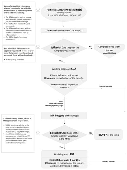 Up to date, SGA is not easy to diagnose [,,]. The sudden appearance, persistence, and growth of one or more subcutaneous lumps in a child usually incites parents to seek help from a physician [,,]. These patients often see a number of specialists, such as pediatricians, pediatric surgeons, pediatric orthopedic surgeons, or pediatric dermatologists []. Most of the time, thorough diagnostic work-up is completed in order to identify the entity of an unclear subcutaneous lesion. Unfortunately, due to the present ambiguity, surgical intervention is frequently performed in patients with SGA which would not require any intervention [,,].
