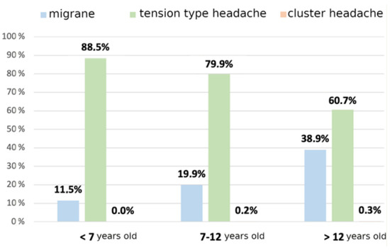 Among primary headaches, according to age, migraine increases, while tension headache lowers (Figure 2).