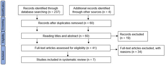 Using the search strategy outlined above, we identified a total of 237 studies in the databases, as well as 4 additional records identified through other sources, which was via the reference lists of the initial papers that were retrieved. Of these 241 items, 181 were duplicated records. The remaining 60 studies were evaluated by title and abstract by 2 independent reviewers. Of these, 19 were excluded due to differences in inclusion criteria as they were observational studies, clinical trials without control group or the participants were not children. After that, 41 full texts were assessed for eligibility and 34 were excluded because participants had previously undergone surgery in the lower limbs, or the FO they were prescribed had been used for less than 2 months, among other reasons. Thus, only seven papers fully met the inclusion criteria. Figure 1 shows the PRISMA flow diagram for the studies included in this review.