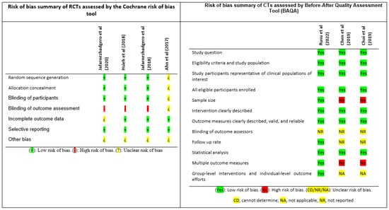 To evaluate the RCTs, the tool recommended by the Cochrane manual was used to assess the risk of bias. It is a domain-based assessment that evaluates each domain with three possibilities: ‘low risk of bias’, ‘high risk of bias’ or ‘unclear risk’ [50]. To assess the CCTs, the “Before-After Quality Assessment Tool (BAQA)” developed by the National Institute of Health (NIH) in collaboration with the Cochrane team, among others, was used. It is a tool that answers 12 very specific questions to assess key concepts of the internal validity of the studies [51].