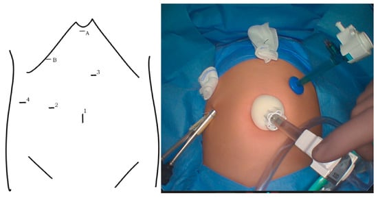 Port placement: 10 mm port for 30° laparoscope in the umbilicus (1), and three device ports of 3–5 mm (2–4). Transcutaneous sutures for the elevation of the falciform ligament (A) and gallbladder (B).