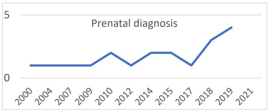 A total of 59 infants, 44 females, and 15 males underwent total cyst resection with end-to-side Roux-en-Y hepaticojejunostomy. Age at surgery ranged from 11 to 345 days (median 116 days), and body weight ranged from 800 g to 10.5 kg (median 5.9 kg). In 20 patients (33%), prenatal ultrasound examination detected an infrahepatic cystic lesion prenatally. The remaining 39 patients had been diagnosed after birth. Of the 59 patients, 26 had a fusiform dilatation of CBD (Todani type 1C) and 33 had a cystic dilatation of CBD (Todani type 1B). The percentage of patients diagnosed prenatally has been rising in our population, from 50% in 2001 to 71% in 2019. Absolute values are shown in Figure 3.