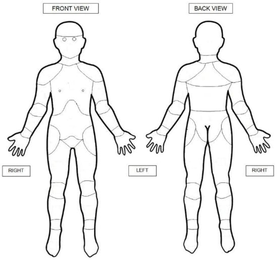 - von Baeyer, C.L.; Lin, V.; Seldman, L.C.; Tsao, J.C.; Zeltzer, L.K. Pain charts (body maps or manikins) in assessment of the location of pediatric pain. Pain Manag. 2011, 1, 61–68. [Google Scholar] [CrossRef]