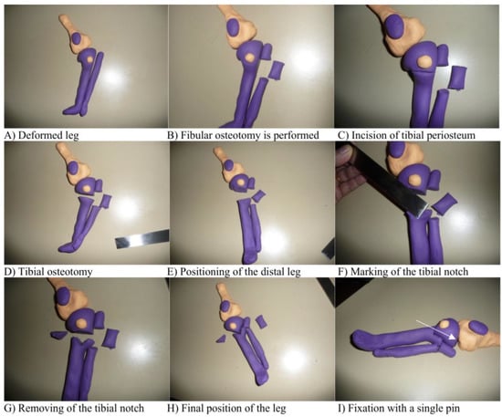 (A–I). Model of surgical steps with purple dough representing the tibia and the patella and the light dough representing the femur and the tibial tuberosity.