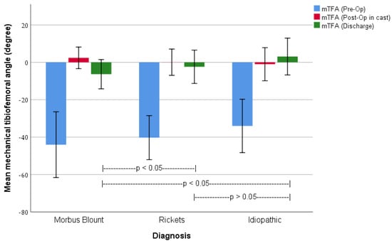 Chronological development of the mean mechanical tibiofemoral angle grouped by etiology of the deformity. Boxes represent the mean value, whiskers show the standard deviation, and p-values show significances between the different etiologies of the mean value of mTFA at discharge.