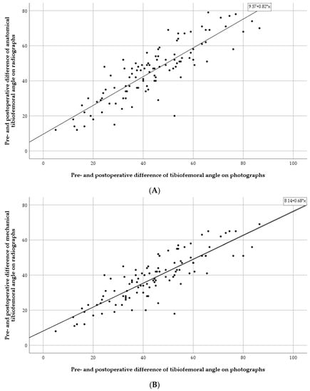 Scatter plots of pre- and postoperative differences of the tibiofemoral angle measured on radiographs and photographs. (A) Anatomical tibiofemoral angle and photographs. (B) Mechanical tibiofemoral angle and photographs.