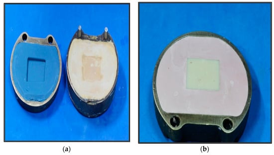 A customized mold was fabricated using a putty index. The mold was packed in a brass flask as a standard mold for all tested materials (Figure 2a). The dimensions of the mold were 40 × 45 × 15 mm. Each of the four provisional restorative materials to be tested was initially fabricated in the dimensions of 40 × 45 × 15 mm. (Figure 2a).