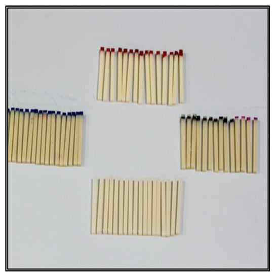 The edges of each block were discarded, while the remaining portion of the rectangular specimens was sectioned further with the help of the Isomet cutting machine calipers. The caliper dimension was adjusted to 2.4 mm, taking into consideration the disc thickness (every two sections from the starting point measured 1 mm in thickness). The specimens were sectioned to obtain the final 15 samples of each of the four provisional restorative materials, Figure 4. The final samples had dimensions of 25 × 2 × 2 mm. A total of 60 specimens were obtained from all four groups of provisional restorative materials.