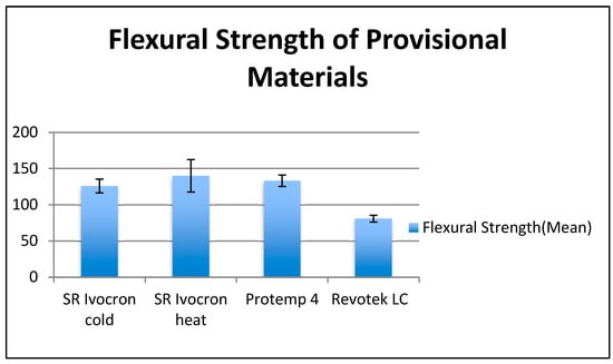 In this study, the experimental conditions were standardized, while potential errors in testing were reduced by fabricating all provisional restoration material specimens on the same day. A single trained operator handled the preparation of all the samples, and the measurements were made after prior calibration. All samples were refrigerated at 5 °C. The reason for differences in the flexural strengths between groups could probably be traced to the differences in polymerization technique, filler, and monomer content. When evaluating the flexural strength, the groups of SR Ivocron heat-polymerized PMMA (Group 2) showed the highest flexural strength among all the groups. This result is consistent with a study done by Donovan et al. []. In their study on the longevity of resin materials, they compared the porosity and hardness of resins polymerized under different polymerization conditions, as in air, under water, under air pressure, and water and air pressure only. They observed that polymerization within a pressure vessel using air and water increased the strength and reduced the porosity of the resin material []. Conventional methacrylate resins are monofunctional, linear molecules with low molecular weights, decreased strength, and rigidity. Many authors have proved that heat-polymerized resins are denser, stronger, more wear-resistant, fracture-resistant, and more color-stable than auto-polymerized resins. Moreover, improper polymerization techniques that are not carried out under adequate pressure or temperature conditions may lead to reduced material strength due to air bubble entrapment [] In some specific cases, heat-polymerized resin may even be suitable for long-term temporary restorations [,].