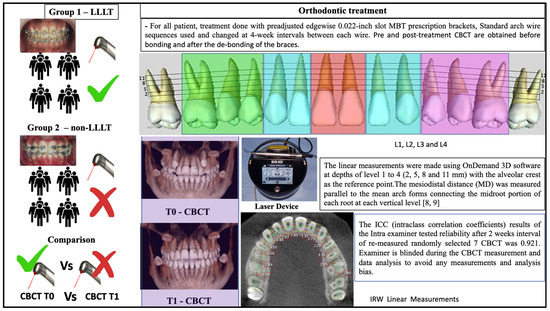 The details of the methodology for the application of the LLLT and the measurements and reliability of the IRW are clarified in Figure 2 [8,9]. CBCT images were acquired before treatment (T0) and immediately after treatment (T1) and were used to measure the IRW changes. The FOT average duration in both groups was 20.015 months, being 19.40 and 20.63 months in the LLLT and non-LLLT groups, respectively.