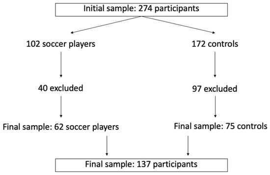The current study only considered participants with two moments of evaluation (baseline (TM1) and follow-up (TM2)). From the initial sample, 40 soccer players were excluded due to age or lack of assessment at least once. Additionally, 97 boys were excluded from the control group due to age, the lack of evaluation at one time point, or the engagement in a sports activity between TM1 and TM2.