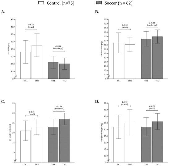 Intraindividual changes (TM1 and TM2) between groups for fat mass (A), fat-free mass (B), sit-ups (C), and handgrip strength (D).