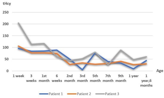 The dose of betaine was adjusted according to the tHcy and Met levels. The trend in plasma tHcy (p-homocysteine) levels is schematized in Figure 1.