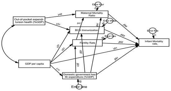 Our analysis used pooled panel data from 2000 to 2019 from the World Bank Health Nutrition and Population Statistics. This dataset was from the data catalog of the World Bank which provides data on key health, nutrition, and population statistics gathered from international sources (such as the WHO). Some of the series included in this indicator were the population dynamics, nutrition, reproductive health, health financing, medical resources, immunization, infectious disease, HIV/AIDS, and population projection. Furthermore, based on the literature, we considered the GDP per capita, out-of-pocket expenditure on health, BCG immunization, maternal mortality ratio, fertility rate, domestic general government expenditure on health, and infant mortality rate for testing several causal paths simultaneously over 20 years (2000–2019) in Ethiopia. Analyses were performed using SPSS AMOS and STATA 14. The dataset we used is freely available https://data.worldbank.org/ (accessed on 4 October 2022).