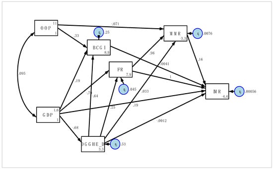 In addition to the above established relationships of the variables in the model, structural relationships between the set of variables were taken into consideration. Table 4 represents the covariance of how much two variables move together. The relationship between MMR and IMR ( = 0.99), MMR and FR ( = 0.99), and MMR and GGHE-D ( = 0.79) was positive and increasing while the relationship between MMR and BCGI ( = −0.75), MMR and OOP ( = 0.17), and MMR and GDP ( = 0.96) was negative and decreasing (see Table 4). The value of the covariance did not give any more information further than the directionality [27].
