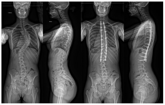 - Ilharreborde, B.; Dubousset, J.; Le Huec, J.C. Use of EOS imaging for the assessment of scoliosis deformities: Application to postoperative 3D quantitative analysis of the trunk. Eur. Spine J. 2014, 23 (Suppl. S4), 397–405. [Google Scholar] [CrossRef]