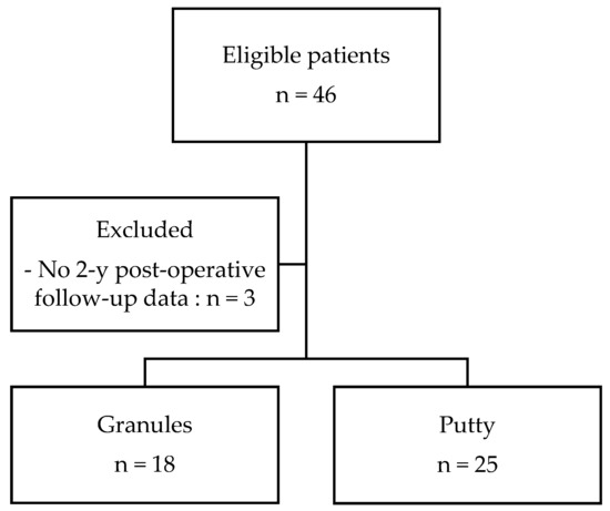 Patient characteristics. Comparisons were computed between the granule and putty groups. There was no significant difference between the 2 groups.