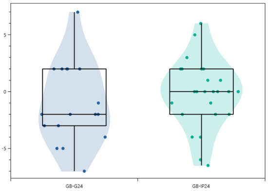 Box plots of loss of correction in the granule group (GB-G24) and the putty group (GB-IP24) groups, 24 months follow-up. There were no outliers. More than 50% of the data are included in the box plot for each material. The median is 0 for the putty group and −2 for the granule group. The results reflect little or no loss of correction.