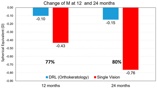 As we can see in Table 4, when comparing only the subjects with the two-year treatment (n = 310), we found that in terms of the refractive error there were statistically significant differences for Sph and M changes in both groups. Showing an increment in myopia of −0.12 ± 0.32 D and −0.70 ± 0.63 D in Sph terms and −0.15 ± 0.33 D and −0.76 ± 0.33 D in M terms for DRL and SV, respectively. In light of the results, we can conclude that in spectacle wearers, the increment in myopia was −0.58 ± 0.06 D in Sph and −0.62 ± 0.06 D in M terms, more than contact lenses DRL wearers. In the 12 month analysis, we observed clinically insignificant values for the astigmatism components (<0.05 D), despite the statistical significance found.