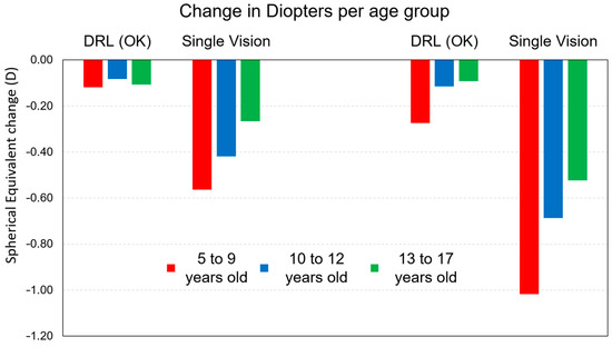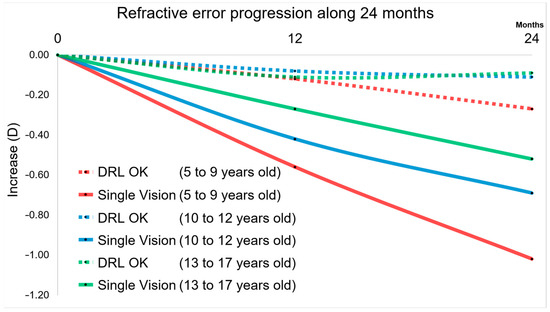 These results can be more easily observed in the graphical analysis of Figure 3. In fact, both at 12 months and 24 months, it is visible the impact of DRL lenses in a smaller increment compared to glasses (SVG). This result is much more expressive in the 5–9 years age group and in the 10–12 years age group.