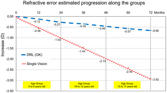 Myopia progression for all participants linking the end and the beginning of each age group. Even not being same individuals, an overall trend may be inferred for both groups. Thus, a projected different M component change by −2.26 D after 6 years for a child starting myopia at 8 years compared to wearing orthokeratology lenses or single vision lenses. This accounts for a 3-fold increase risk in macular degeneration or retinal detachment.
