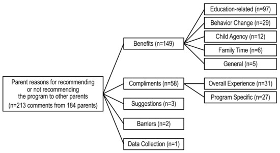 For the question: “Please tell us your reasons for recommending or not recommending the program to other parents”, 213 comments were grouped into five categories (Figure 1). The category with the most responses was benefits, receiving a total of 149 comments. Comments related to benefits were grouped into 5 subcategories: education-related (n = 97), behavior change (n = 29), child agency (n = 12), family time (n = 6) and general (n = 5).