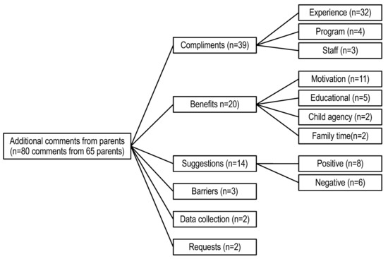 Parents were also given an opportunity to respond to the question “Is there anything else about this program that you would like us to know”. Responses from 65 parents were grouped into six categories, listed in descending order: compliments, benefits, suggestions, barriers, data collection and requests (Figure 2).