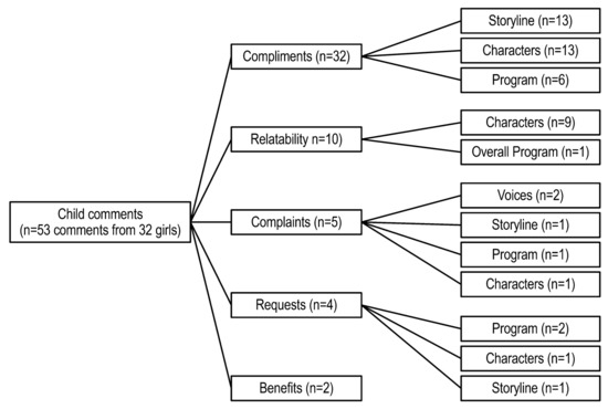 Girls (n = 32) provided responses for the question “if there is anything you would like to tell us about the characters, their voices, the story, or the program, please type it in here”). Responses were grouped into five categories: compliments, relatability, complaints, requests and benefits. Results for each category are summarized below and in Figure 3, supported by representative comments to provide additional insight. As with parents, to ensure categories accurately captured child comments, responses could be coded into multiple categories, depending on response content. A total of 53 comments were coded.