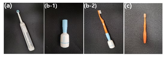 The toothbrushes used in this research. (a) electro-toothbrush (Oral-B, Procter and Gamble, Kronberg, Germany); (b-1) smart toothbrush machine (XiuSolution, Gyeonggi, Republic of Korea); (b-2) machine linked to a manual toothbrush, referred to as a smart toothbrush; and (c) manual toothbrush (AIOBIO, Seoul, Republic of Korea).