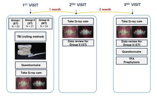 All participants were also given fluoride-containing toothpaste and randomly assigned to ET, ST, or MT groups during the entire experimental period. A one-to-one TBI lesson was provided to each participant. Afterward, all participants were photographed using a Q-ray cam and brushed their teeth by themselves for three minutes with the assigned brush. All three groups used the rolling method. Thereafter, their teeth were checked once more using the Q-ray cam, and areas with remaining plaque were confirmed by a dentist. For the ST group only, the dentist sent feedback via the application once a week depending on the time, condition, and score of the teeth that could be received via the application.