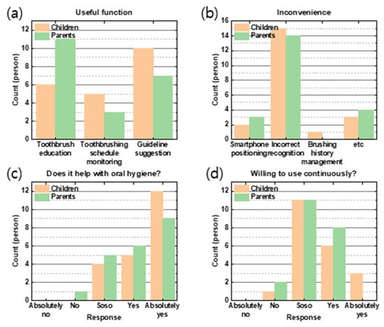 Responses from smart toothbrush users. The orange bar represents children, and the green bar represents parents. The x-axis shows the answers, whereas the y-axis shows the counts of the persons. The following questions were asked: (a) “What are the useful functions of ST?”, (b) “What are the inconveniences associated with using ST?”, (c) “Does ST help with oral hygiene?”, and (d) “Are you willing to use ST continuously?”.