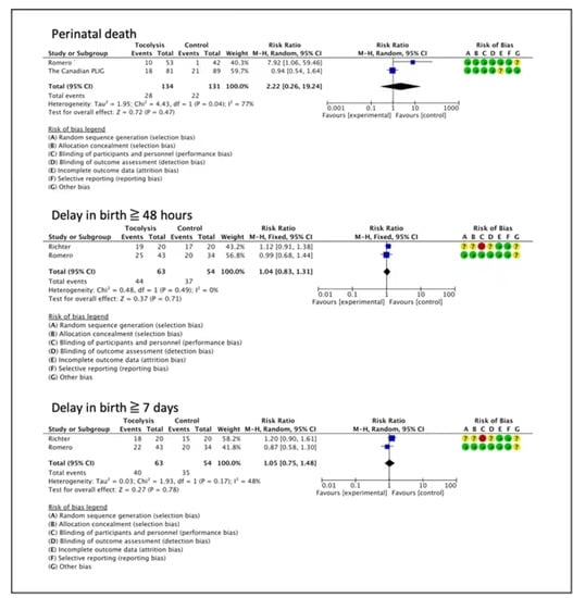 Perinatal death was reported in two trials, and the intervention group did not exhibit a clear difference compared to placebo or no treatment (RR 2.22, 95% CI 0.26 to 19.24, 2 trials, 265 neonates, very low certainty evidence) (Figure 2) [27,29]. As is shown by the meta-analysis of data from two trials, there may not be a difference in a delay in birth ≥ 48 h (RR 1.04, 95% CI 0.83 to 1.31, two trials, 117 women, low-certainty of evidence) [28,29], and a delay in birth ≥ 7 days (RR 1.05, 95% CI 0.75 to 1.48, two trials, 117 women, low-certainty evidence) (Figure 2) [28,29].