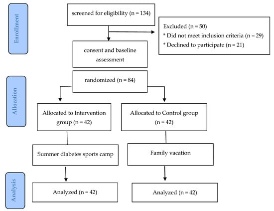 The study was a randomized controlled trial (Figure 1). After the baseline evaluation, the online statistical computing web program “www.randomizer.org (accessed on 30 June 2021)” was used for the randomization process. Children and adolescents with T1DM were randomly assigned into two groups: the intervention group (n = 42), who participated in a 10-day summer diabetes sports camp, and the control group (n = 42), who were asked to continue their daily routine without participating in any physical activity intervention.