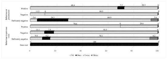 The number of DGA sessions provided to the children was in the following order: nil (22%), one session (12.2%), two sessions (63.4%), and three sessions (2.4%). Analysis of the factors which had an association with the number of DGA sessions delivered for ASD children revealed an association with the severity of the disorder (p = 0.029) (Table 7). Furthermore, there was an association with the behavior of the child both in previous visits and at presentation (p < 0.0001) (Figure 1). The reason for the repeat DGA sessions was “dental caries with pain”. Only two children with ASD had a repeat DGA in the same hospital and that was three years after the initial session.