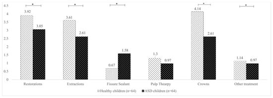 Comparison of the dental procedures under general anesthesia between children with autism spectrum disorder and healthy-matched children (mean values are displayed). * Statistically significant.