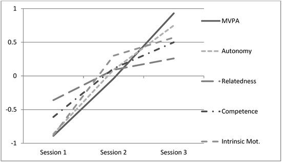 MVPA, basic psychological needs, and intrinsic motivation in sessions one, two, and three.