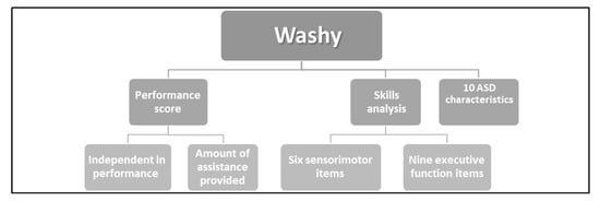Given the need for extensive examination of children’s actual performance along with their EF and SM abilities, and following Katz Zetler et al.’s study results [40] which reiterated the importance of further adapting the Do-Eat to children with ASD with varied functional abilities levels, we adapted the Do-Eat [36,37] into the Do-Eat Washing Hands Structured Observation (Washy) [42]. We adjusted it for ASD and used a BADL self-care task to adapt the tool to children with low functioning levels. To use a task performed on a routine, daily basis and in home and school settings, and that can be done in a public space so that the child’s privacy is not compromised, we chose handwashing. The Washy dynamic assessment circumvents challenges that often surface when evaluating this population [43].