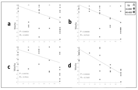 Correlations between Washy and Participation in Childhood Occupation (PICO-Q) performance measures across experiment groups. Note. The relationship between Washy and PICO-Q scores is illustrated using Spearman’s rank correlation coefficient tests of individuals’ Washy’s performance score against their PICO-Q difficulty scores item, including (a) PICO-Q-1, (b), PICO-Q-2, (c) PICO-Q-4, (d) and PICO-Q-16. The participants with typical development (TD; triangles) usually received the lowest scores in both assessments, followed by participants with LS-ASD (diamonds), and ending with participants with HS-ASD (circles), who received the highest (worst) scores in both assessments.