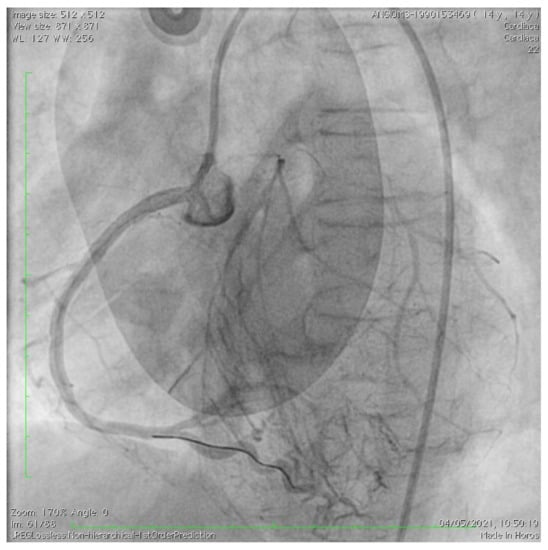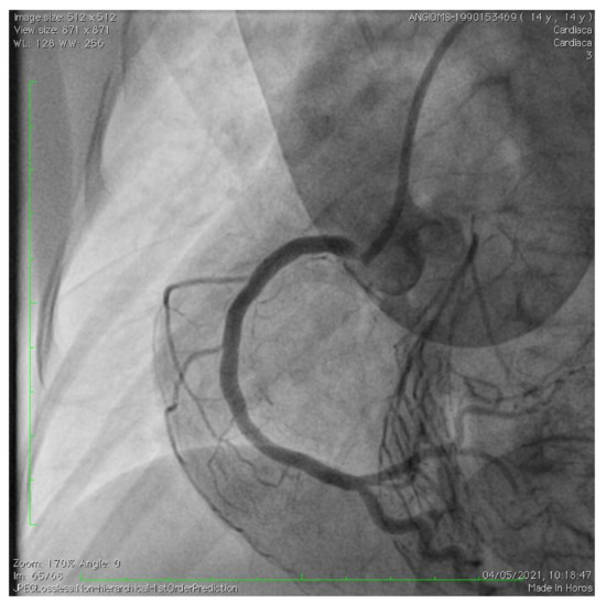 The patient showed a good response to intensive therapy with intravenous nitrates and calcium channel blockers, with disappearance of pain, blood pressure normalization, and improvement of the ST segment modifications at ECG (Figure 1B). After the acute phase, a coronary CT angiography was performed. A severe obstruction of the common trunk of the left coronary artery was observed due to plaque formation, with phenotypic characteristics similar to arteriosclerosis occurring in geriatric patients, including calcification and evidence of plaque erosion. Ascending aorta calcification was also observed, with regular diameters. Low-dose oral antiplatelet, high-potency statin, and anti-hypertensive drugs were started. A multidisciplinary team, including pediatric cardiologists, pediatricians, an adult cardiologist, and a coronary interventionalist, decided to have the patient undergo PCI in a pediatric cardiology and cardiac surgery center (IFC-CNR Massa Cardio-thoracic Centre). Interventional cardiac catheterization was performed from the right femoral artery. Aortic angiography imaged complete chronic occlusion of the left main coronary artery that was severely calcified at the origin, as well as ninety-five percent stenosis at the origin of the right coronary artery, which perfused the anterior interventricular coronary artery through collateral circulation (Figure 2). This vessel did not show any further significant stenosis downstream and completely vascularized the left ventricular segments supplied by the left coronary artery. The right coronary artery was probed using an Amplatz right (AR1) guiding catheter, through which a large 3.5 mm drug-eluting coronary stent (Xience Sierra, Abbott, USA) was implanted (Figure 3). At the end of the procedure, no residual stenosis and improved revascularization of the left coronary artery distribution segments was imaged (Figure 4). No attempt was made to probe the left main coronary artery due to severe calcification of the origin as well as a complete supply of its distribution territories by a very enlarged right coronary artery. A few days after intervention, the patient was transferred again to Meyer Children’s Hospital in Florence and discharge was possible after one week. Dual antiplatelet therapy (DAPT) was prescribed, with a combination of aspirin (75 mg daily) and clopidogrel (37.5 mg daily) and anti-hypertensive therapy.