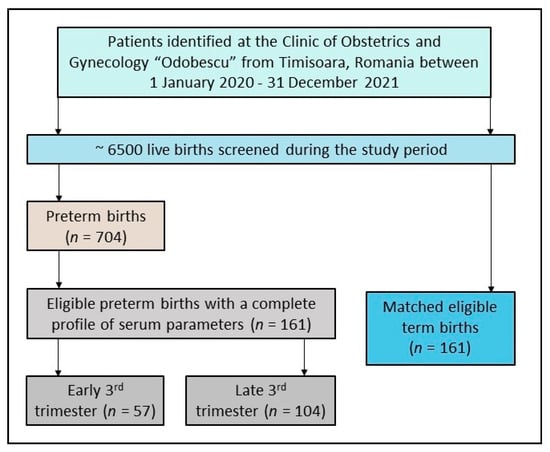 According to existing guidelines, preterm delivery was considered when the birth happened before 37 weeks of gestation [17]. The third trimester of pregnancy was considered as the period between 27 weeks of gestation until birth [18,19], and all laboratory data presented in this study were collected during the third trimester, before the onset of labor. The HALP score was computed based on the formula hemoglobin (g/L) × albumin (g/L) × lymphocytes (/L)/platelets (/L) [20].